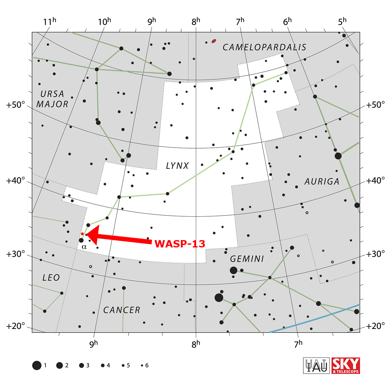 WASP-13 lies in the constellation of Lynx. Its coordinates are right ascension 09:20:25.0 and declination +33:52:57. The system is at a distance of 225 parsecs from us.