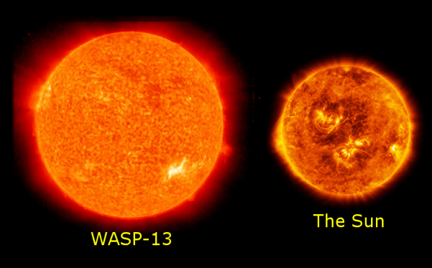 The star WASP-13 has a radius 1.5 times that of the Sun. Its mass and temperature, however, are very similar to the Sun. Its spectral type is G1, whereas the Sun is a G2 star. The fact that WASP-13’s radius is so much bigger means that it is in the process of evolving into a Red Giant star.