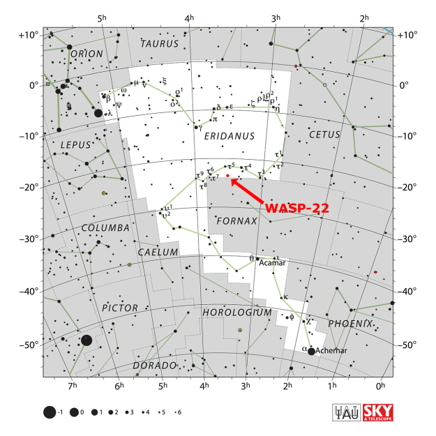 WASP-22 lies in the constellation of Eridanus. Its coordinates are right ascension 03:31:16.0 and declination −23:49:11. The system is a distance of 310 parsecs from us.