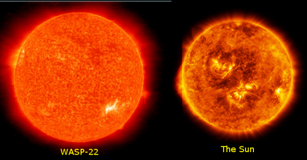 The star WASP-22 is 1.13 times the radius of the Sun so it is slightly bigger. Its spectral type is estimated to be G1, similar to the G2 spectral type of our Sun. WASP-22 has a brightness of visual magnitude 12.0.