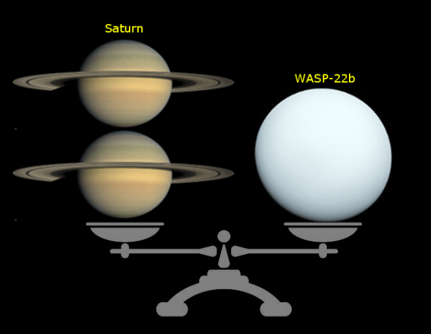 WASP-22b is about double the mass of Saturn, which means that it is about one third the density of Jupiter.