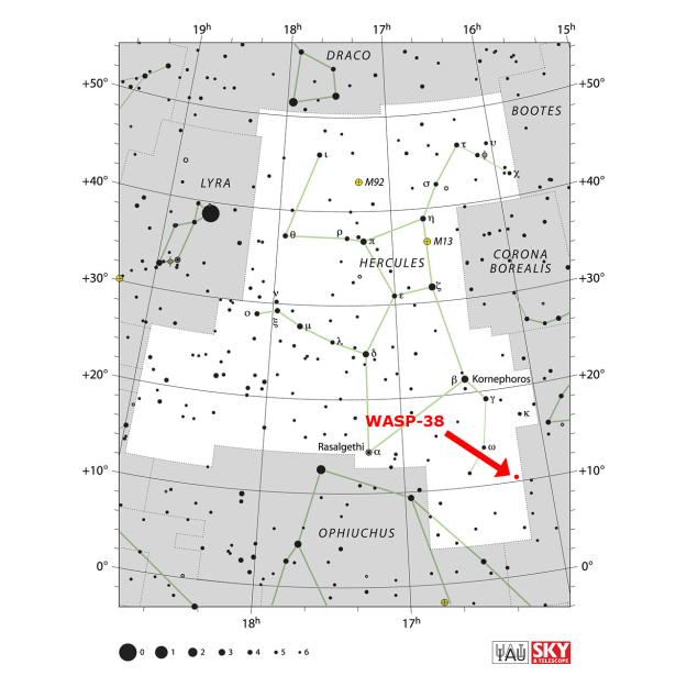 WASP-38 lies in the constellation of Hercules. Its coordinates are right ascension 16:15:50.0 and declination +10:01:57. The system is at a distance of 135 parsecs away from us.