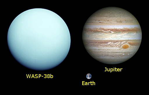 The planet WASP-38b is 1.08 times the radius of Jupiter, the largest planet in our Solar System. It is thus about ten times the radius of our Earth.