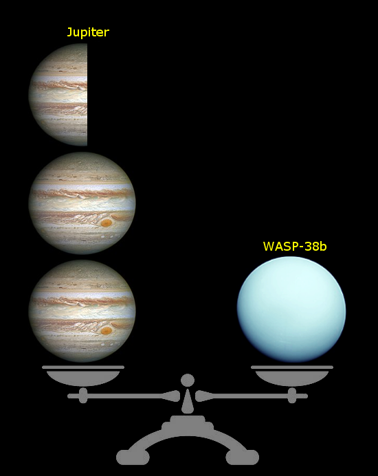 WASP-38b is roughly 2 and a half the mass of Jupiter so is about twice as dense as Jupiter. Maybe it has a dense rocky core surrounded by an envelope of hydrogen gas.