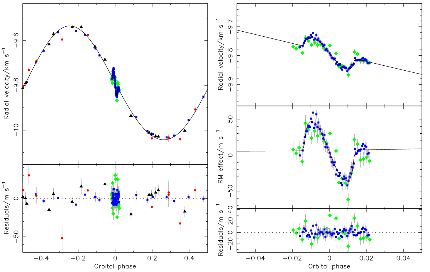 The above plot shows radial velocity measurements of the star WASP-38 over the orbit of WASP-38b. These tell us how the star is moving, and thus how it is being tugged around by the gravity of the planet. The interesting finding is that the orbit of WASP-38b is slightly eccentric. That means that it is in an elliptical orbit, not a circular one. Despite that, the planet is in an aligned orbit. That means that the track of the orbit runs along the equator of the star. This is interesting because we expect that hot-Jupiter orbits become circular faster than they become aligned.