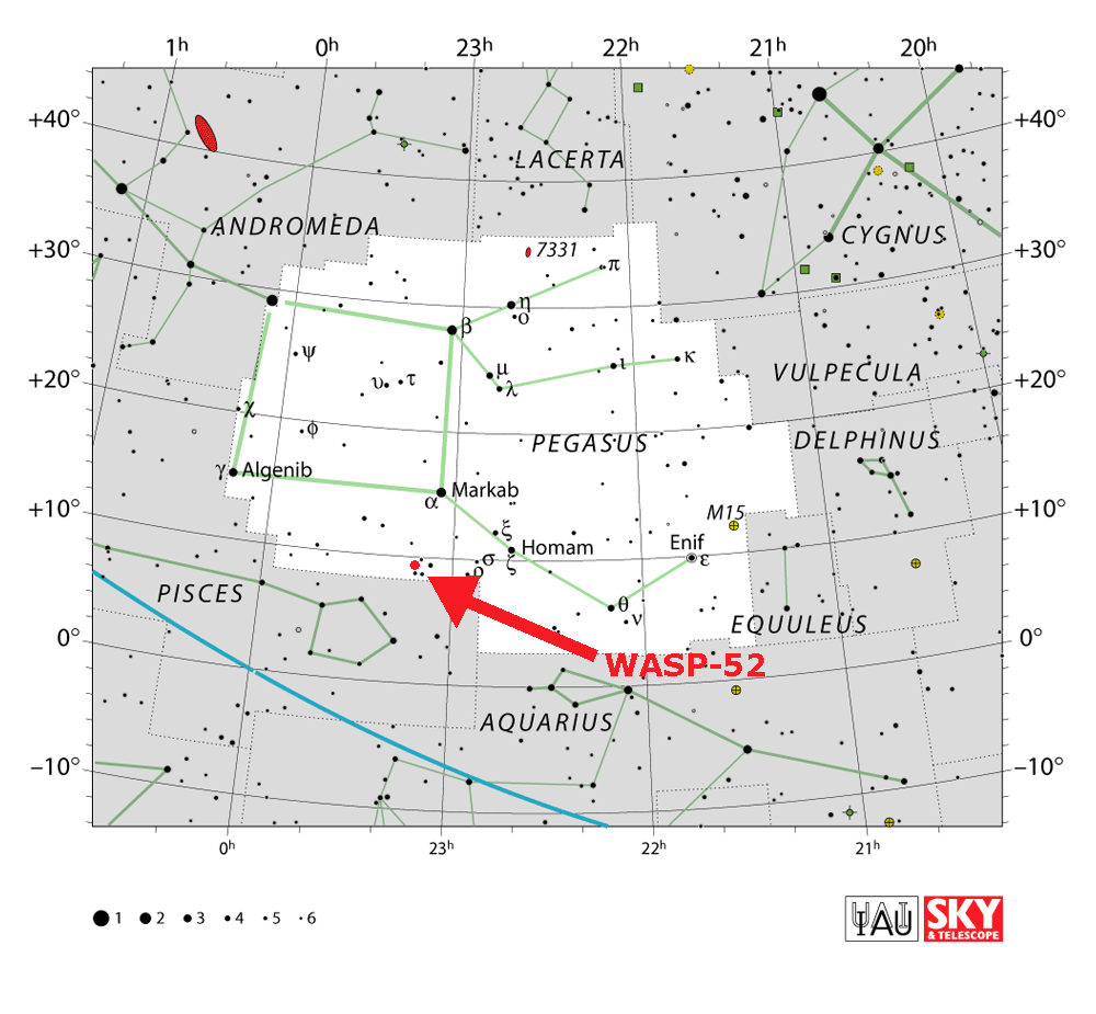 WASP-52 lies in the constellation of Pegasus. Its coordinates are right ascension 23:13:59.0 and declination +08:45:41. The system is at a distance of 175 parsecs from us.