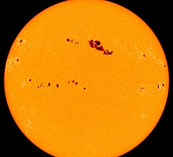 The star that WASP-6b orbits, WASP-6, has “star spots”, just as our sun (left) has “sun spots“. These dark patches are magnetic storms on the surface of the star. We know that WASP-6 has star spots because of what we see when the planet transits across the star: