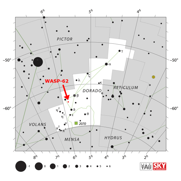 WASP-62 lies in the constellation of Dorado. Its coordinates are right ascension 05:48:34.0 and declination −63:59:18. The system is at a distance of 175 parsecs away from us.