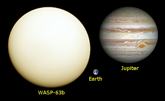 The planet WASP-63b is 1.43 times the radius of Jupiter, the largest planet in our Solar System. That makes it 14 times the radius of Earth. It is giant planet made of gas, whereas our Earth is a small, rocky planet.