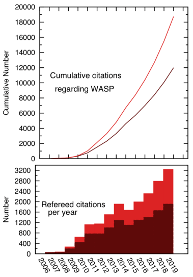 Citations to work on WASP planets. The darker red counts refereed citations to all refereed papers with “WASP” in the title, the lighter red also includes papers mentioning WASP in the abstract (data from an ADS search).