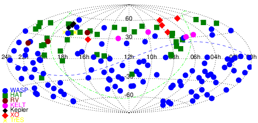 The transiting exoplanets around relatively bright stars are the ones we can best study. The plot shows the sky distribution of bright stars (V < 12.5) known to host a transiting hot Jupiter, colour-coded by the discovery project.
