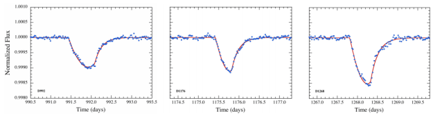 The authors reproduce such dips (red line) with a model of a comet about the size of Halley’s comet and having a tail made of dust, hence giving an asymmetric dip. Another Kepler, KIC 3542116, shows six possible comet transits. Here are three: