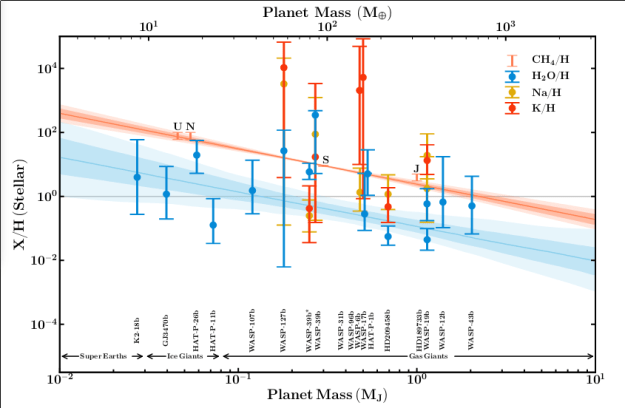 The plot shows the measured water abundance versus the planet’s mass. Welbanks et al state that: “We find a mass–metallicity trend of increasing H2O abundances with decreasing mass”, and also that: “The H2O abundances in hot gas giants are likely due to low oxygen abundances relative to other elements rather than low overall metallicities, and provide new constraints on their formation mechanisms”.