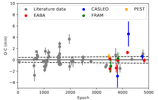 Here is a plot of the timings of the transits of WASP-4b, taken from a new paper led by Luke Bouma: