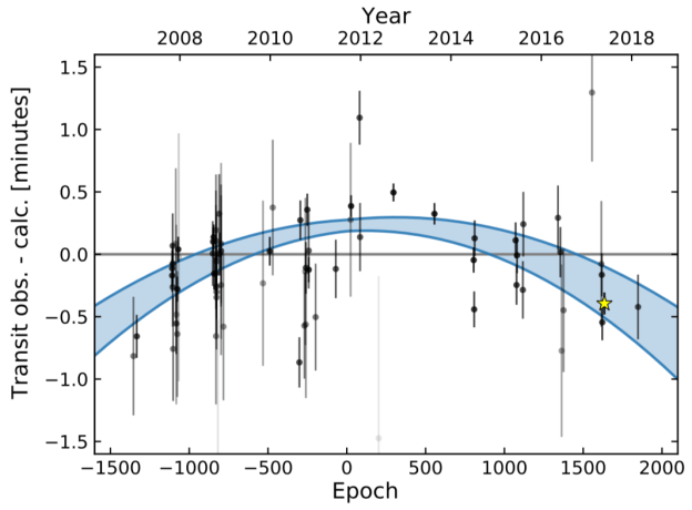 The curve in the plot shows that the transits are occurring progressively earlier as time passes. One possible explanation is that the planet’s orbit is decaying under the influence of the tidal interaction between the star and planet. This is expected to occur in most hot Jupiters, though how quickly is debated.
