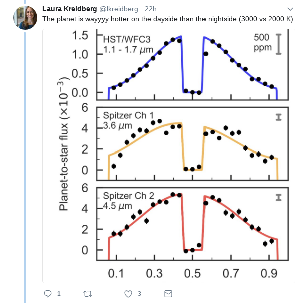 The CHEOPS observations of transits of WASP-103b are shown below (grey points). The blue model is the expected profile for a deformed planet, while the green line (lowest panel) is the expected difference in transit profile between a deformed planet and a spherical planet. The CHEOPS team show statistically that the data prefer the deformed shape, at a confidence level of 3σ.