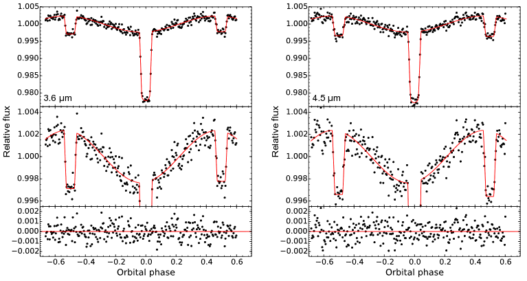The figure shows the infra-red light (“heat”) of the WASP-19 system in two pass bands (3.6 microns and 4.5 microns). The middle panels are expanded to show the phase curve, while the lowest panels show the residuals about a fitted model (the red line).