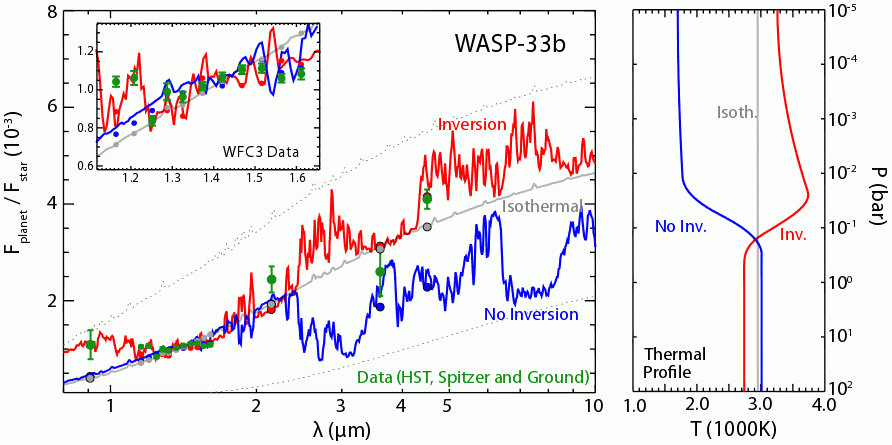 By comparing their analysis of iron lines to a similar analysis for Titanium Oxide, the authors show that there is a temperature inversion (higher temperature at greater height) in the atmosphere of the planet.