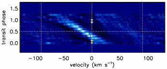 The image shows features caused by iron absorption lines, as a function of time (y-axis). The spectra have all been adjusted so that zero velocity (RV) is centred on the host star, WASP-33. The star’s rotation then causes features over the spread of velocities marked by the dashed yellow lines.