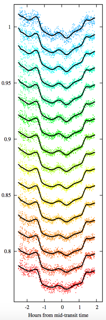 Here’s a plot from a new paper by David Cont et al, of the University of Göttingen. The plot shows spectra of the WASP-33 system, obtained with the CARMENES near-infra-red spectrograph on the 3.5-m telescope at the Calar Alto Observatory.