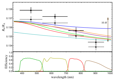 The result is the figure below showing the transit depth in the four different passbands (greater depth implying a larger planet radius, plotted as the ratio of planet to star, Rb/RA).